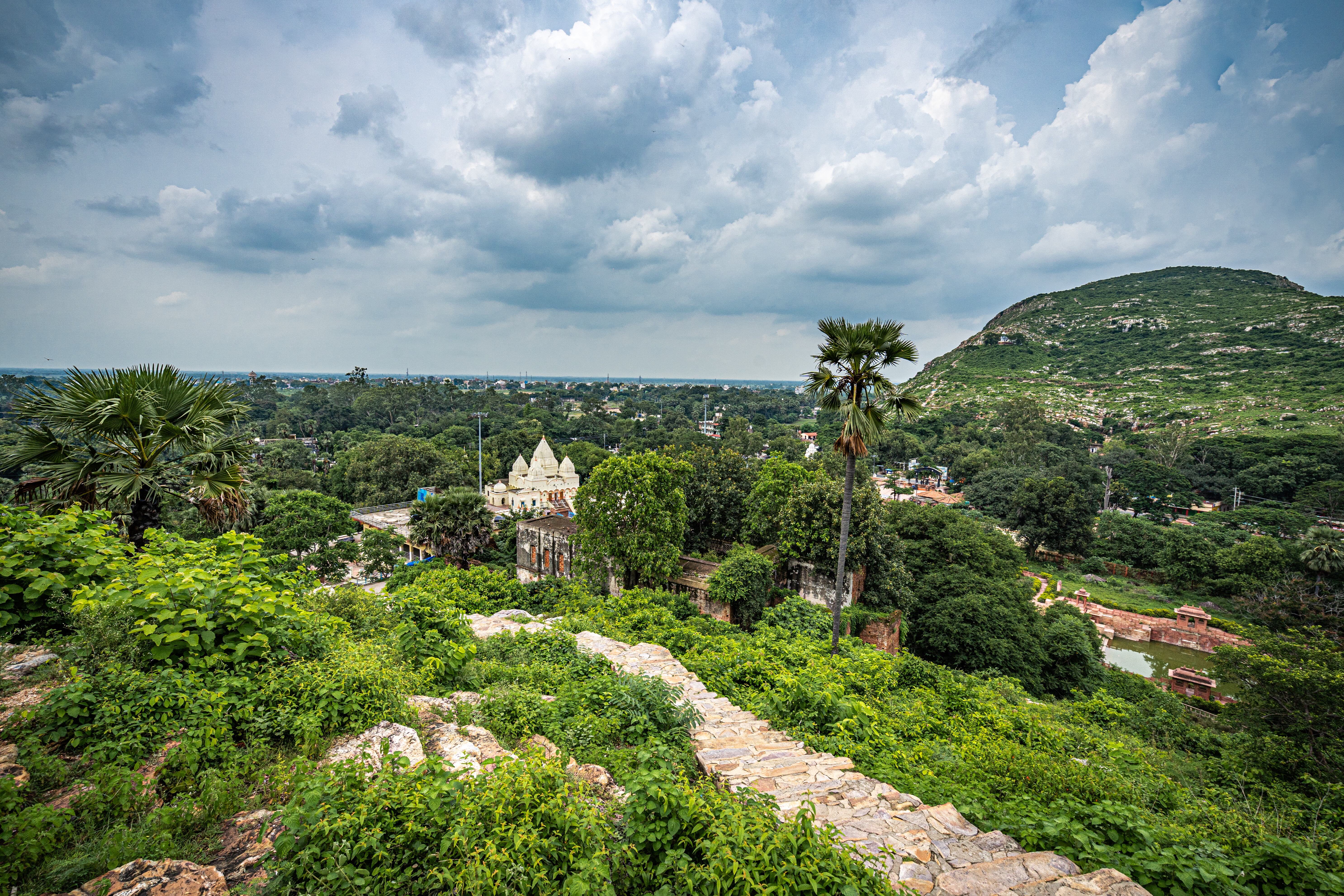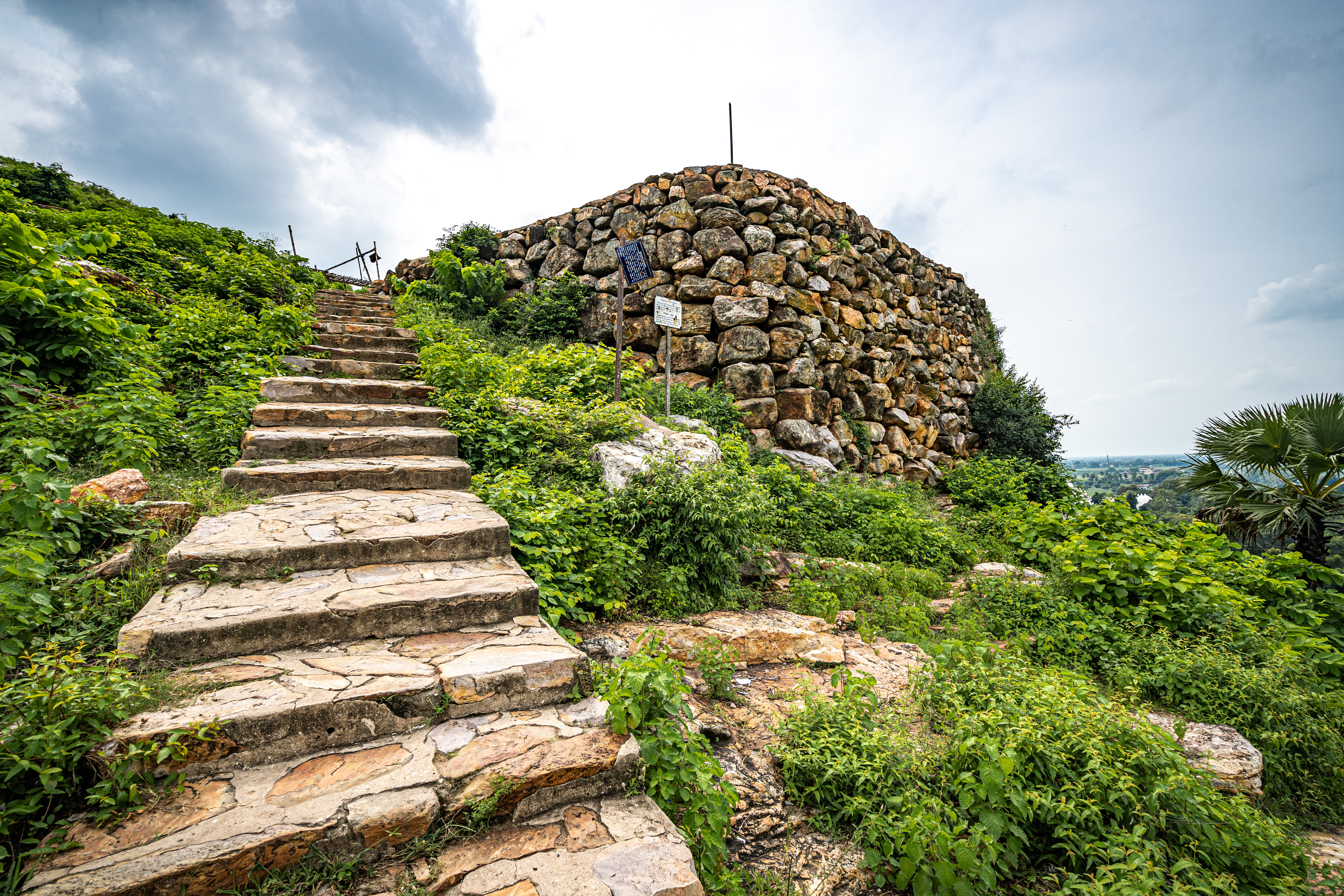 A fairly large 22' high ancient stone structure (Base- 85')(81 'and Top - 81 'x72') is locally known as Jarasandha ki Baithak. The legendary infamous King's meeting quarter. The spot is situated just above the Brahma Kund on the way to Saptaparni caves. However, some scholars believe it is a part of the cyclopean fortification wall that was built for some military purpose.