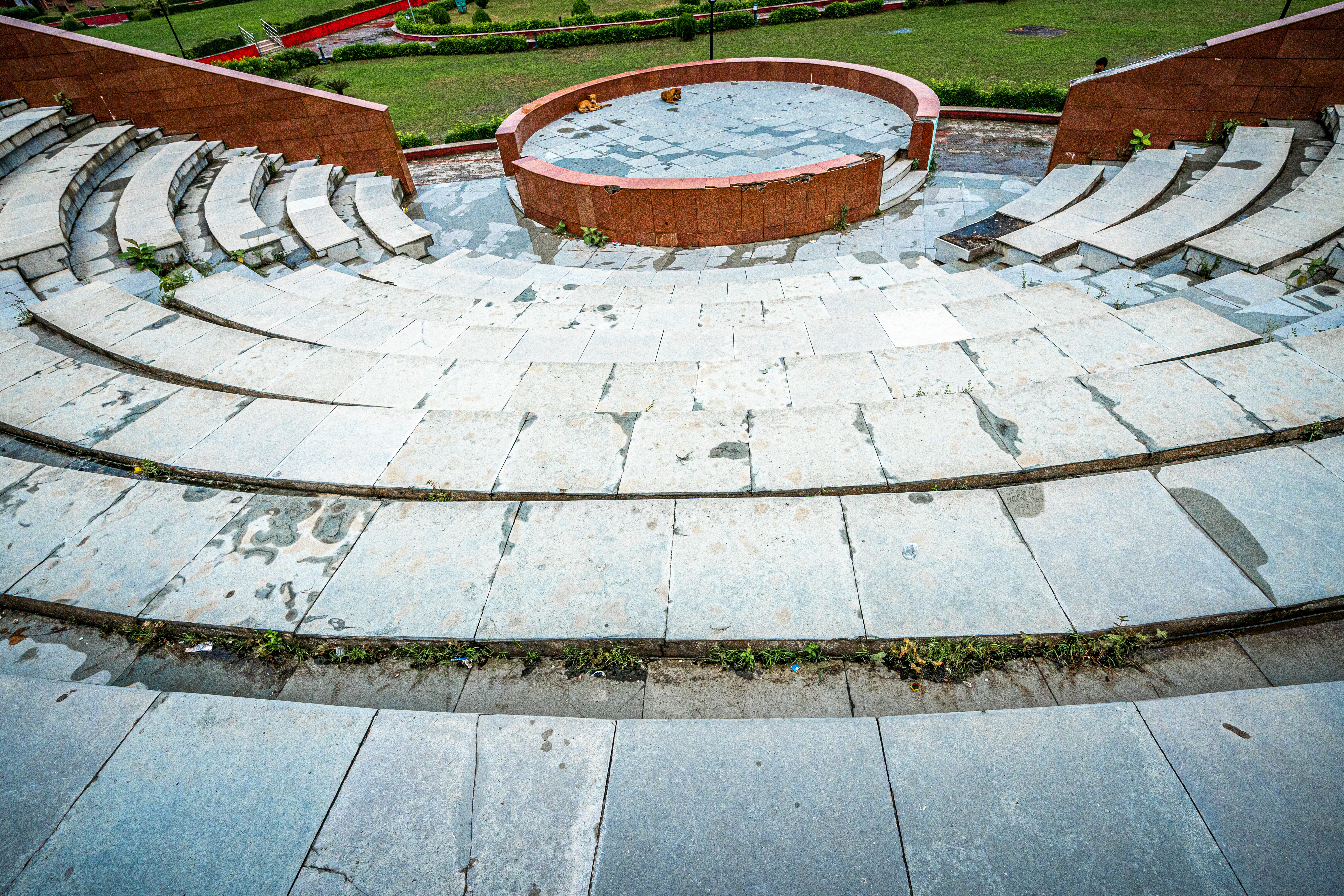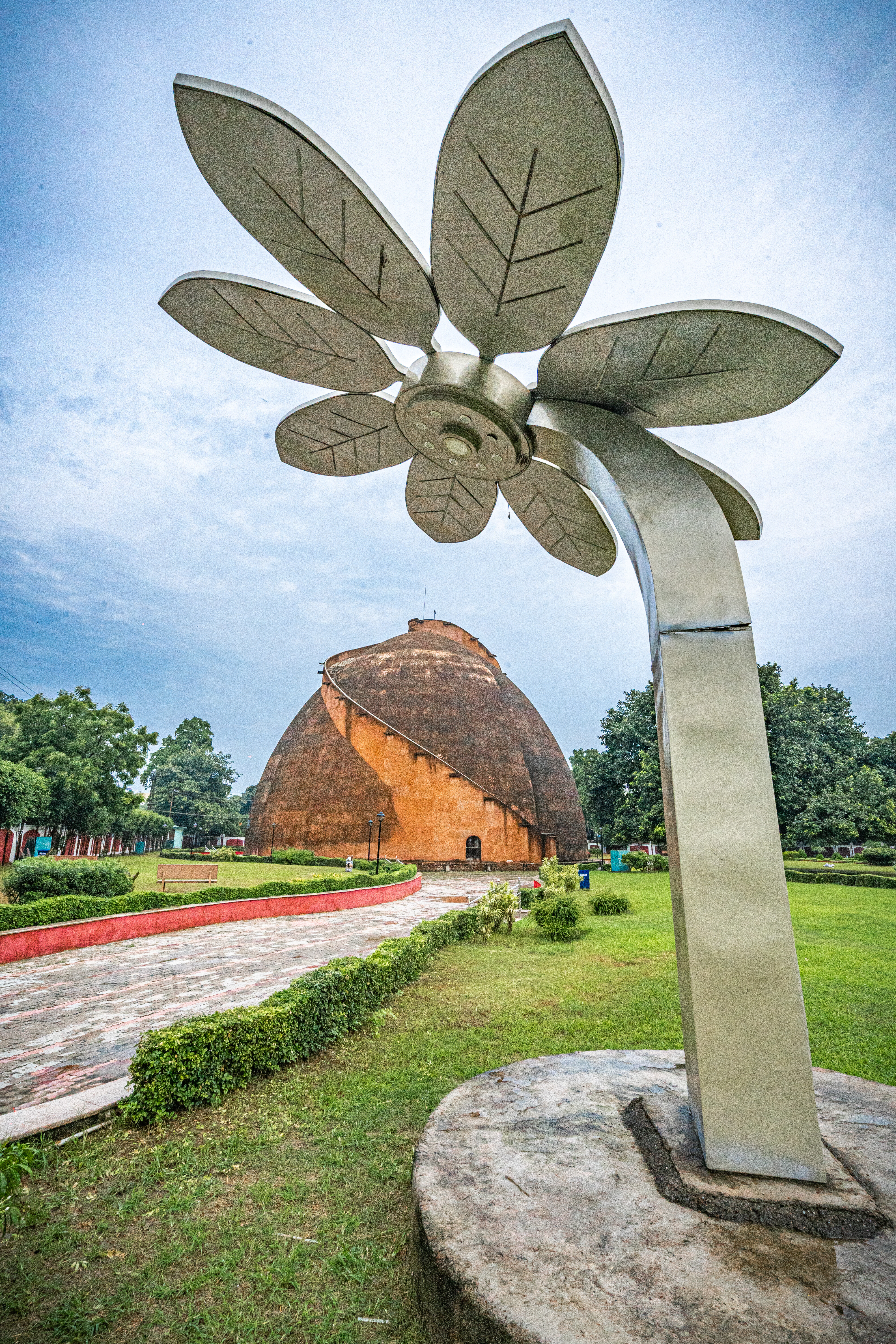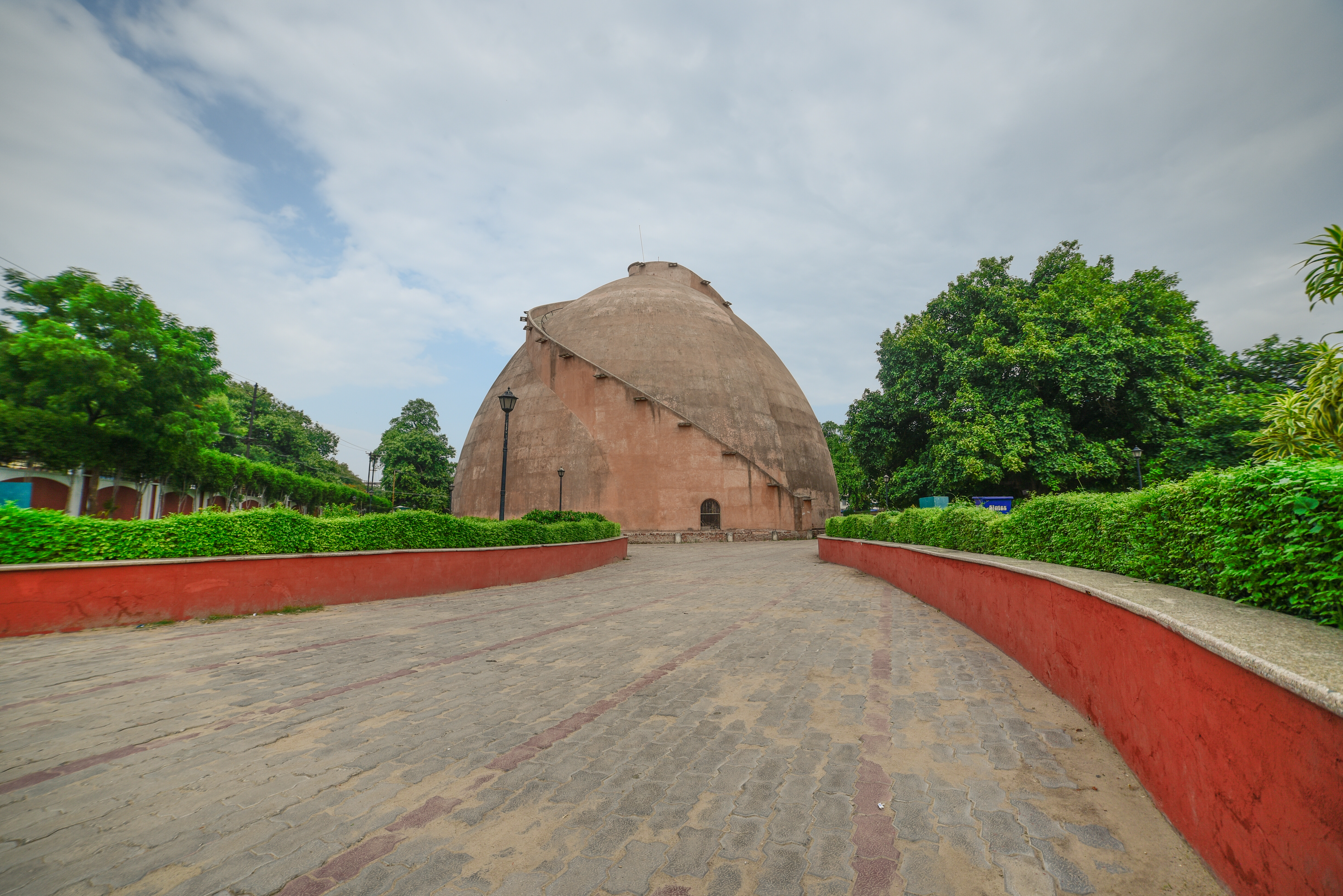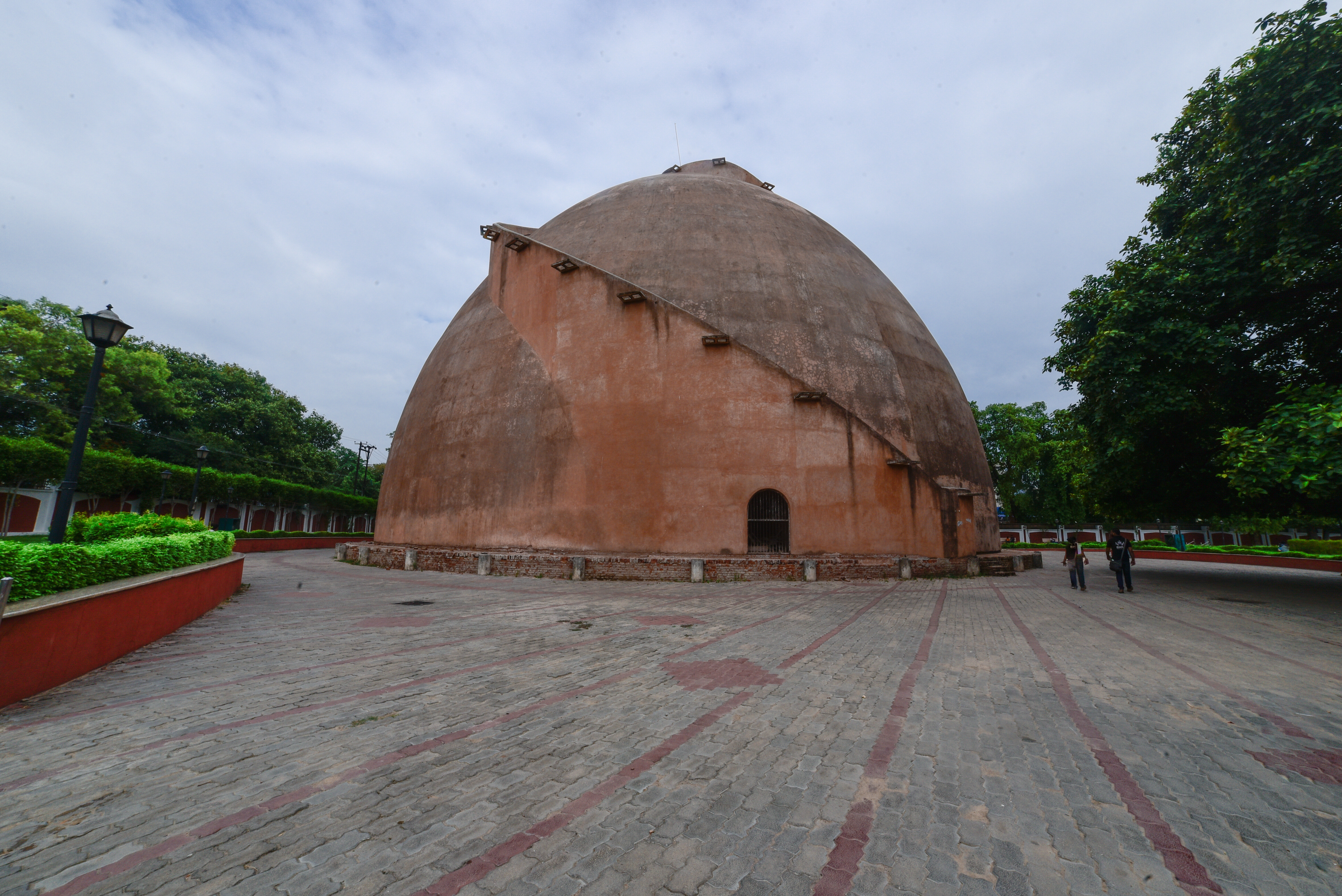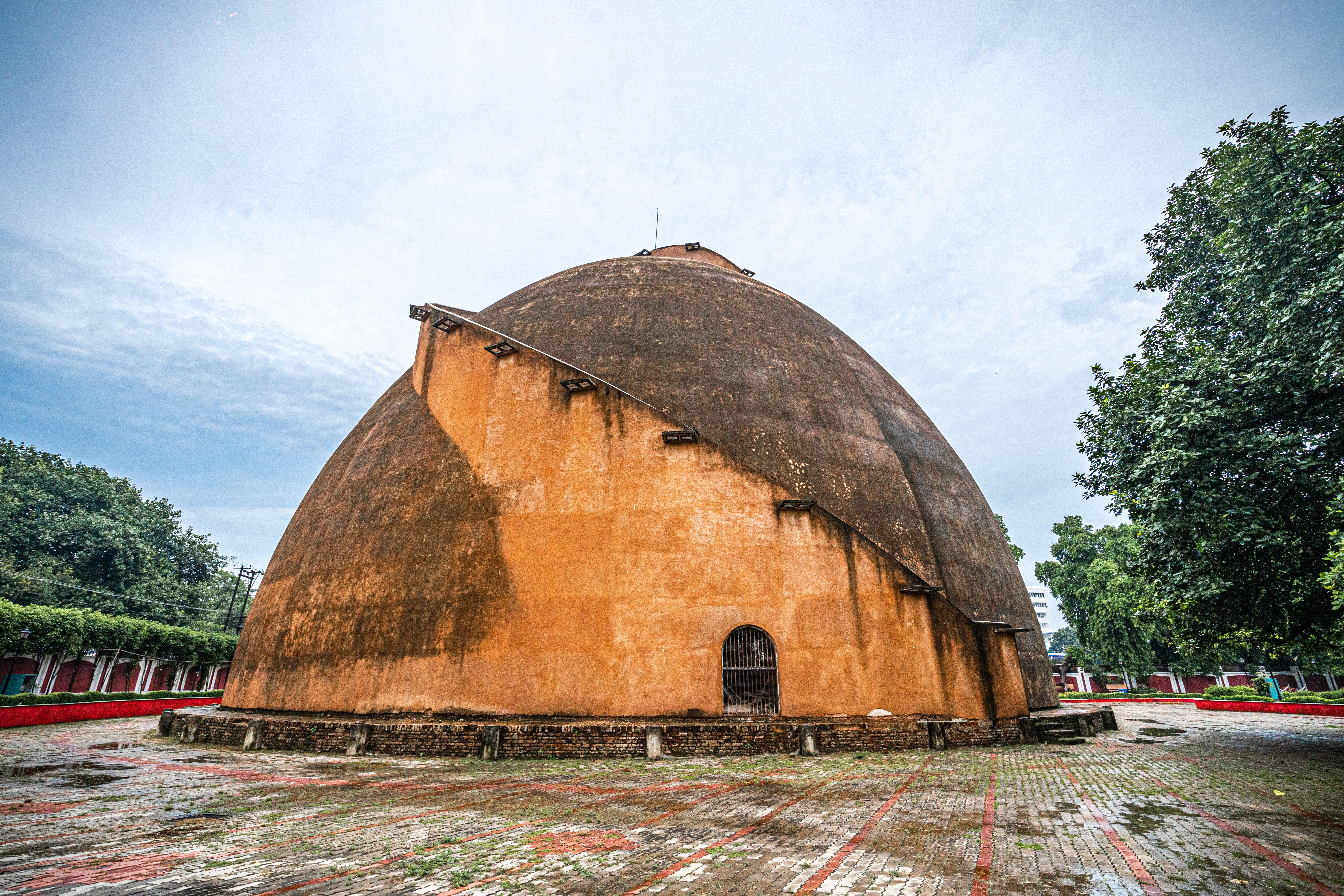 It is pillar-less with a wall of thickness of 3.6 m at the base height of 29 m.. One can climb at the top of the Golghar through the 145 steps of its spiral stairway around it. The spiral staircase was designed to facilitate the passage of the workers who deliver their load through a hole at the top, and descend the other stairs.